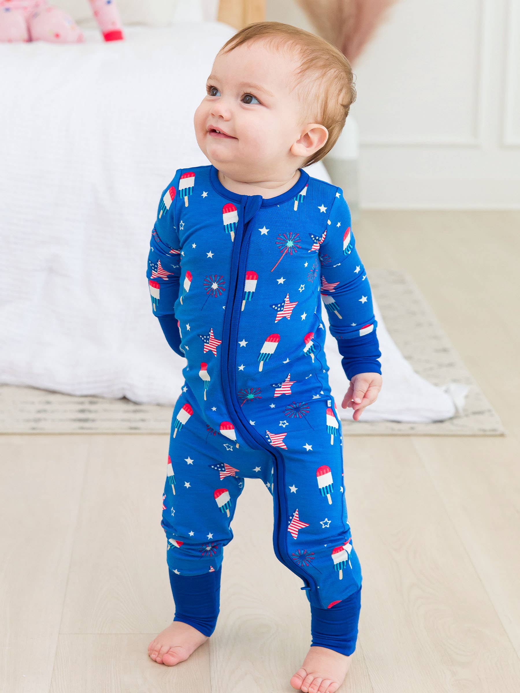 Keep your little one snug and comfortable with the SoftSnooze™ bamboo viscose baby one-piece convertible pajamas! Made from ultra-soft, breathable bamboo viscose, these pajamas are perfect for sensitive skin and keep baby cozy all night. The convenient 2-way zipper makes diaper changes a breeze, while fold-over mitts protect from scratches and fold-over foot cuffs allow for versatility as baby grows. Celebrate the 4th of July in style with this patriotic print!