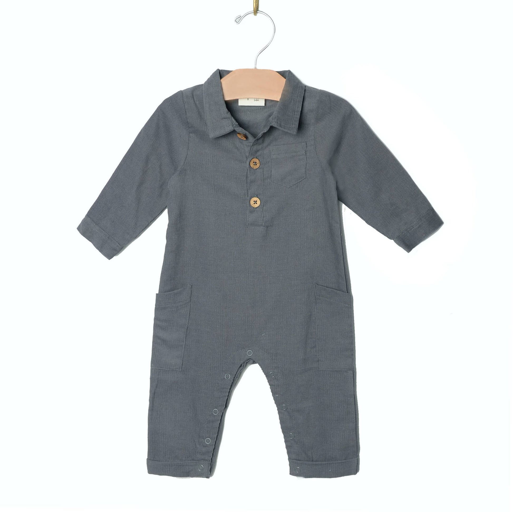 The collar long leg romper in 100% cotton baby cord features coconut buttons at the front and snaps along the legs for easy changing. Functional pockets for his treasures will be his favorite!