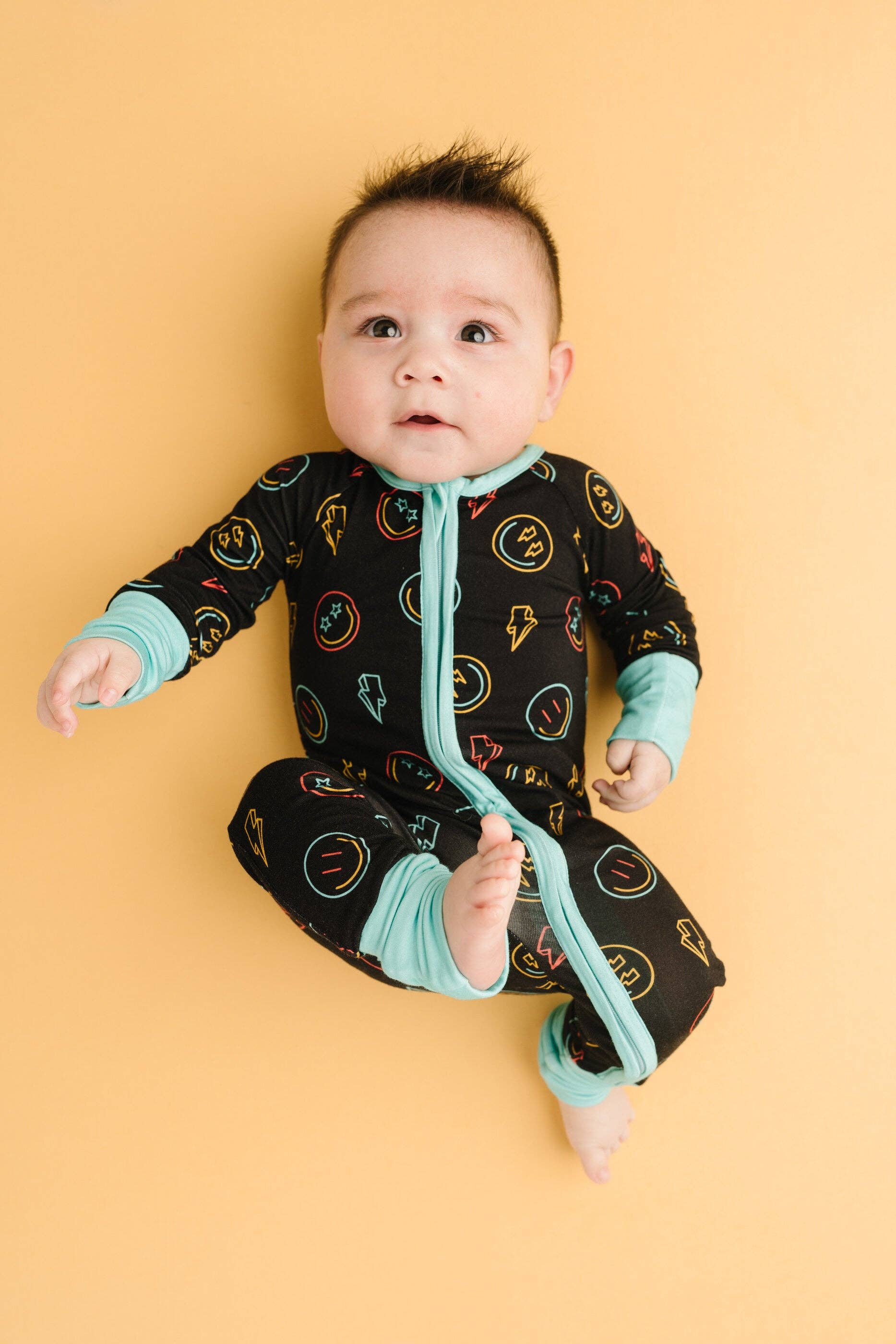 Buttery soft, lightweight, breathable, and stretchy Fold over mittens up to 12-18M Fold over footies Features a 2-way zipper for easier changes