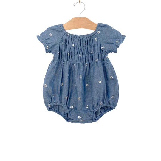 This cutie is made of 100% light chambray cotton and features leg snaps for easy changing. It has smocked detail and daisy print - perfect for Spring and Summer!