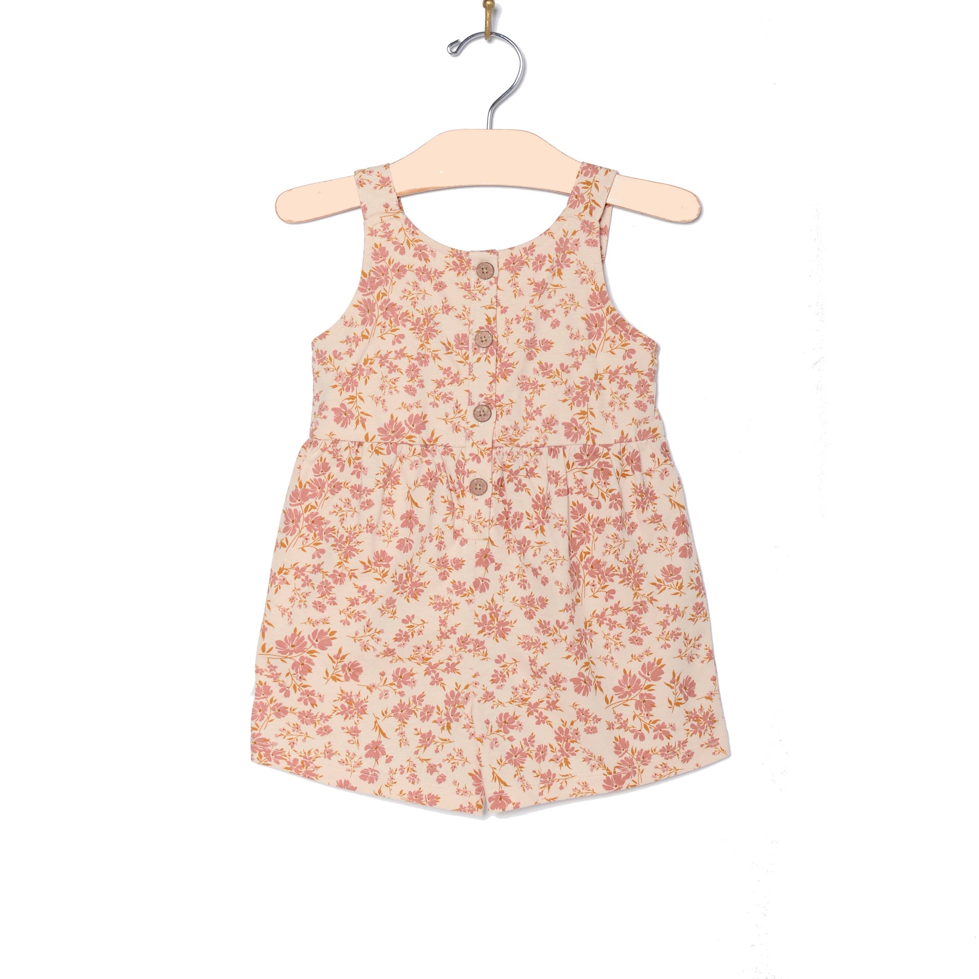 In 100% combed jersey cotton and an elasticized back, this style in the prettiest blush floral romper.