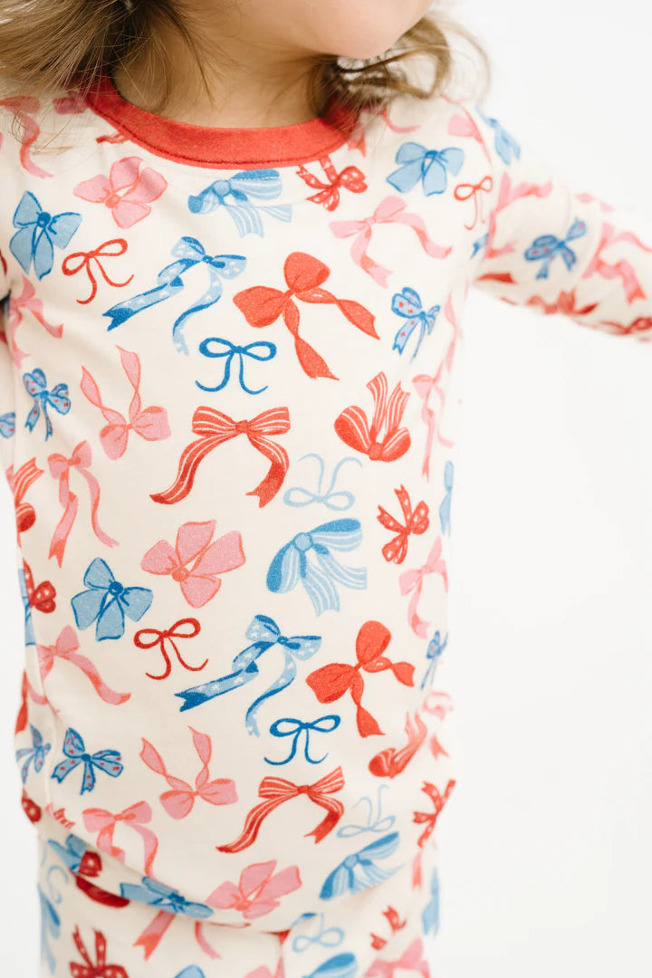 Two piece long sleeve & pant set. In the cutest Red, White and Blue bow. See the same print in sleeper, shortie and dress for a matching moment.