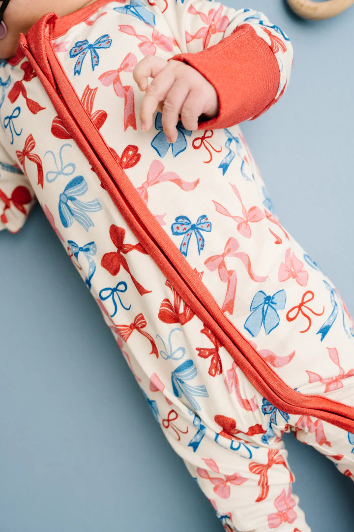 In the cutest Red, White and Blue bow. See the same print in set, shortie and dress for a matching moment. Double zipper and fold over feet to grow with your babe.